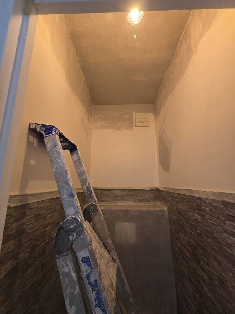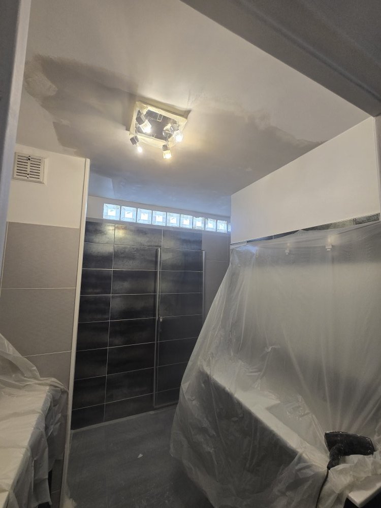Nos équipes ont procédé à une reprise d’enduit partiel sur les murs et plafonds afin de retrouver des supports sains, lisses et homogènes. Cette étape a été suivie d’un ponçage minutieux puis d’un époussetage complet, indispensables pour assurer une finition de qualité professionnelle ✨.